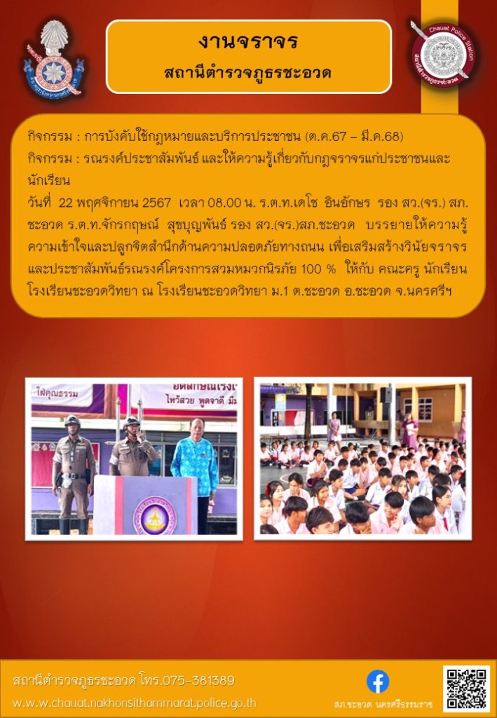 ตำรวจจราจร บรรยายให้ความรู้ความเข้าใจและปลูกจิตสำนึกด้านความปลอดภัยทางถนน รร.ชะอวดวิทยา