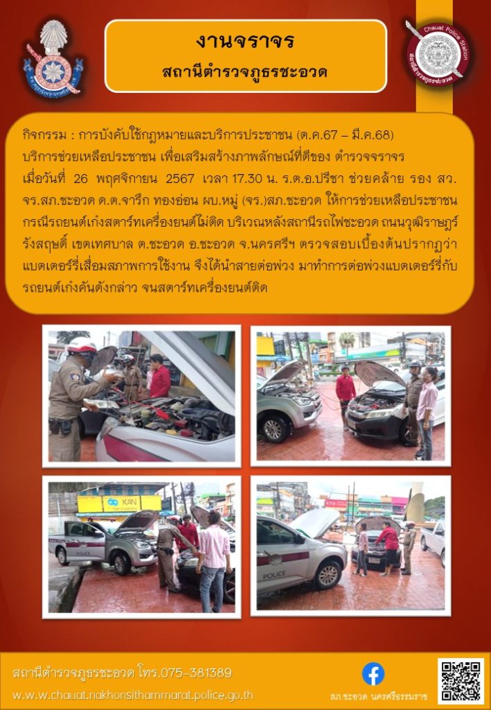 ตำรวจจราจร ให้การช่วยเหลือประชาชนกรณีรถยนต์เก๋งสตาร์ทเครื่องยนต์ไม่ติด