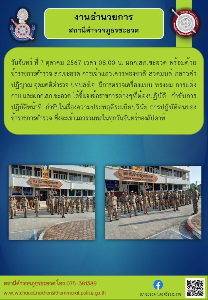 ฝ่ายอำนวยการ พร้อมเจ้าหน้าที่ธุรการ เข้าแถวเคารพธงชาติ รับฟังภารกิจและข้อสั่งการ ทุกวันจันทร์ของสัปดาห์