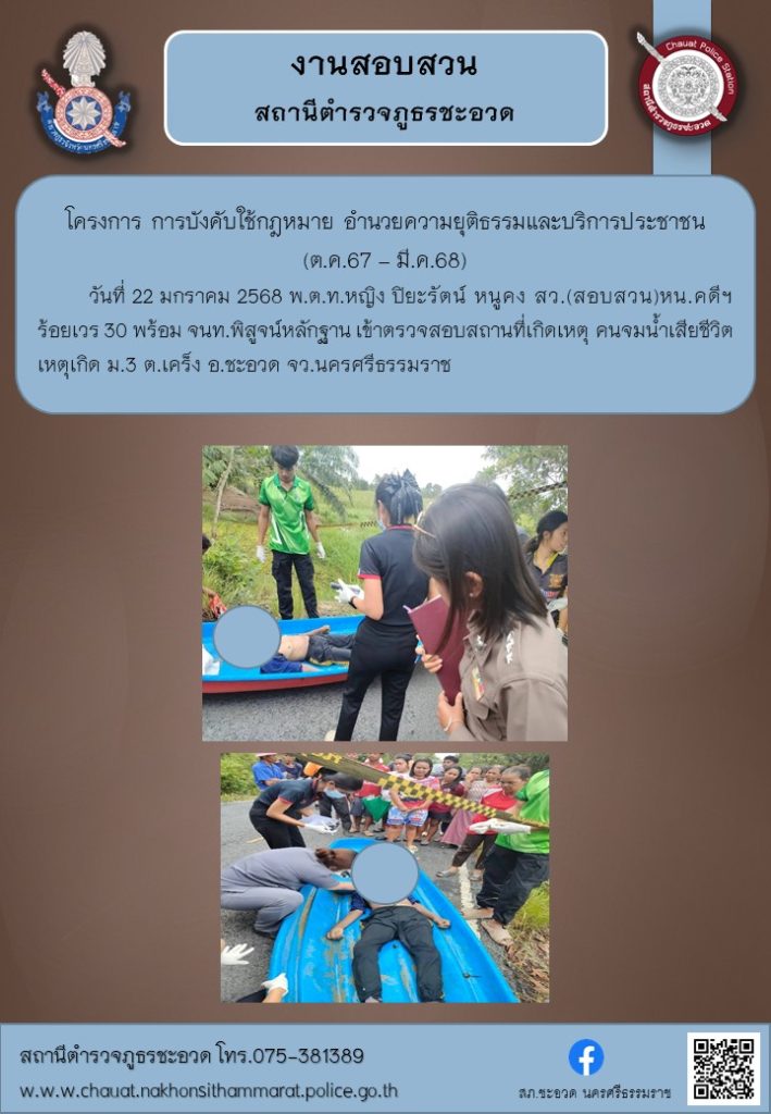 พนักงานสอบสวน ตรวจสอบที่เกิดเหตุ จมน้ำเสียชีวิต ม.3 ต.เคร็ง