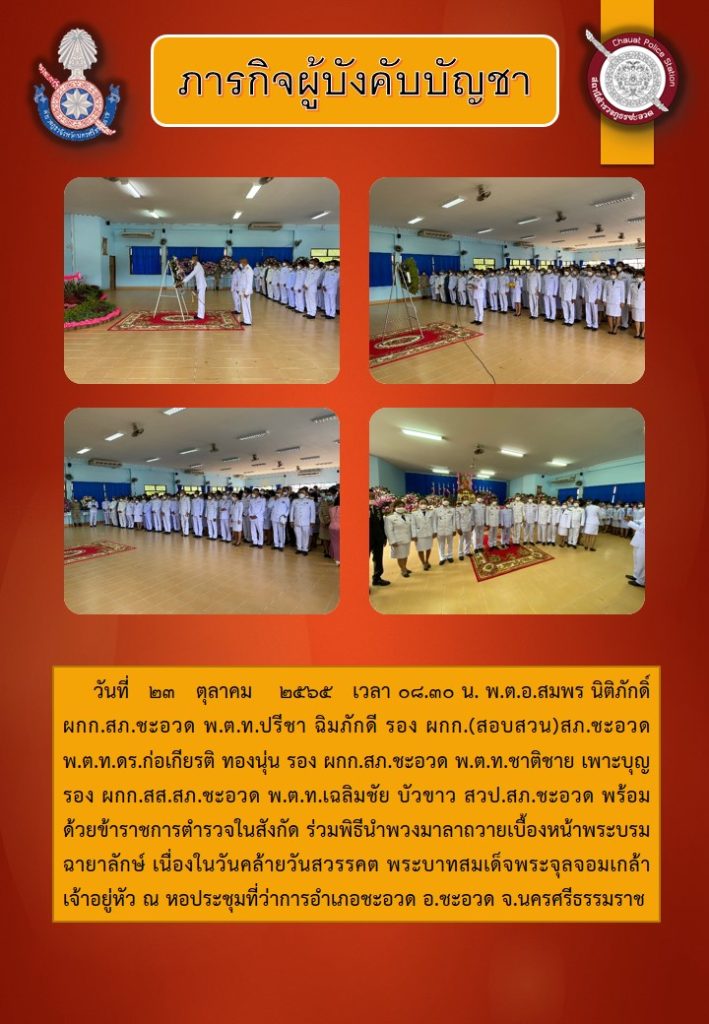ภารกิจผู้บังคับบัญชา ๒๓ ตุลาคม ๒๕๖๕ 23 ตุลาคม 2565 โดย admin / ข่าวภารกิจผู้บังคับบัญชา,โครงการจิตอาสา ร่วมพิธีวางพวงมาลา เนื่องในวัน "ปิยมหาราช" กิจกกรมจิตอาสาเนื่องในวัน "ปิยมหาราช"
