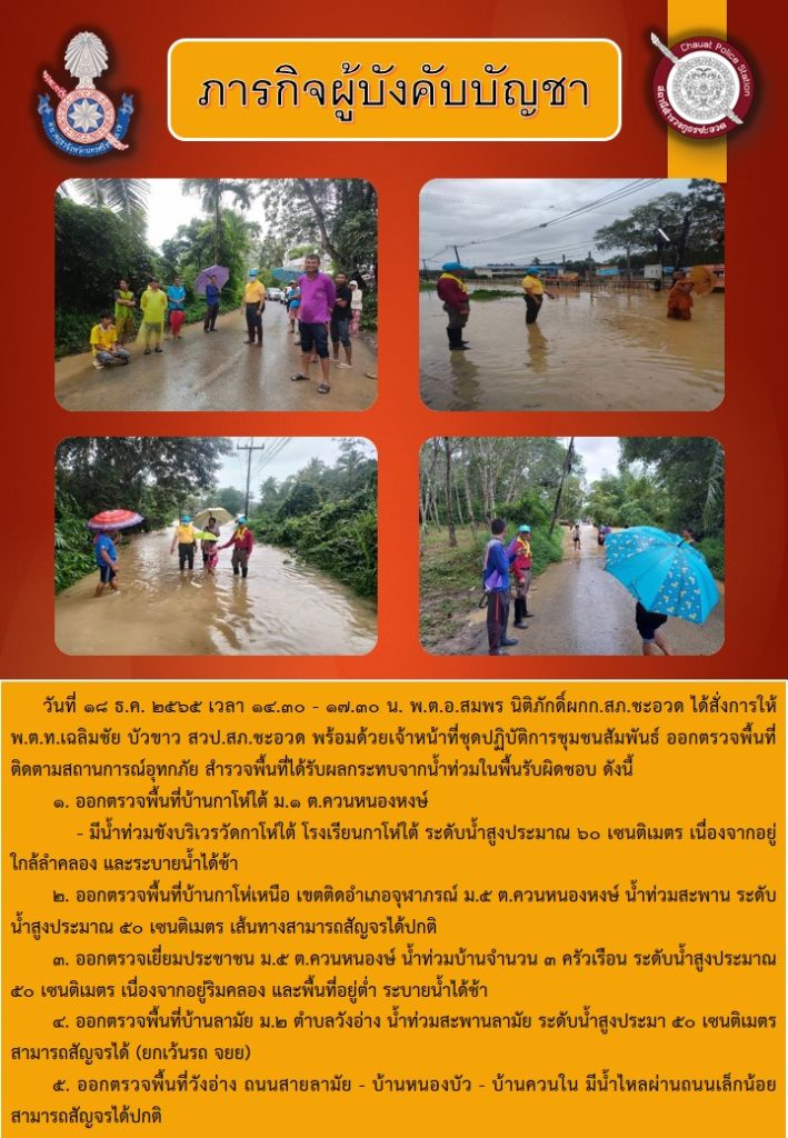 ภารกิจผู้บังคับบัญชา ๑๘ ธันวาคม ๒๕๖๕ 18 ธันวาคม 2565 โดย admin / ข่าวภารกิจผู้บังคับบัญชา,ข่าวการเสริมสร้างคุณธรรมจริยธรรม ตำรวจ,ข่าวประชาสัมพันธ์,ข่าวภารกิจผู้บังคับบัญชา,ข่าวภารกิจผู้บังคับบัญชา,ชุดปฏิบัติการตำรวจชุมชนสัมพันธ์,โครงการจิตอาสา ลงพื้นที่ติดตามสถานการณ์อุทกภัยเเละช่วยเหลือประชาชนที่ได้รับผลกระทบ