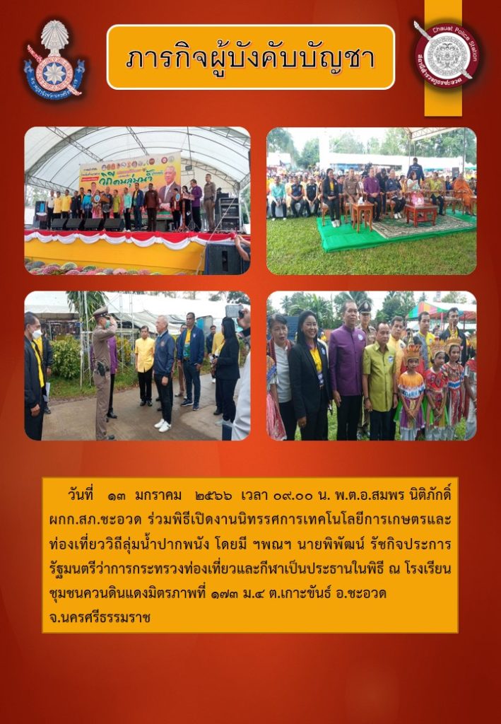 ภารกิจผู้บังคับบัญชา ๑๓ มกราคม ๒๕๖๖ 13 มกราคม 2566 โดย admin / ข่าวประชาสัมพันธ์,ข่าวกิจกรรม,ข่าวประชาสัมพันธ์,ข่าวประชาสัมพันธ์,ข่าวฝากประชาสัมพันธ์,ข่าวภารกิจผู้บังคับบัญชา ร่วมพิธีเปิดงานนิทรรศการเทคโนโลยีการเกษตรเเละท่องเที่ยววิถีลุ่มน้ำปากพนัง