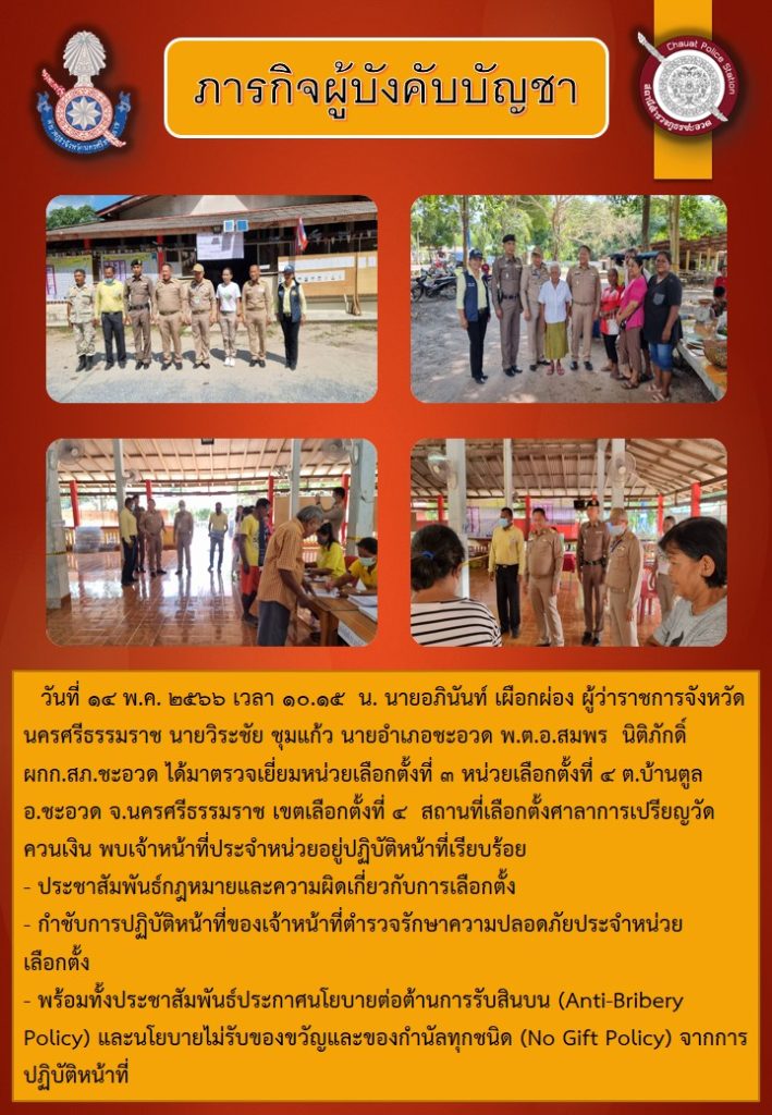 ภารกิจผู้บังคับบัญชา ๑๔ พฤษภาคม ๒๕๖๖ 14 พฤษภาคม 2566 โดย admin / ข่าวประชาสัมพันธ์,ข่าวภารกิจผู้บังคับบัญชา ตรวจเยี่ยมดูเเลความปลอดภัยหน่วยเลือกตั้งในพื้นที่รับผิดชอบ