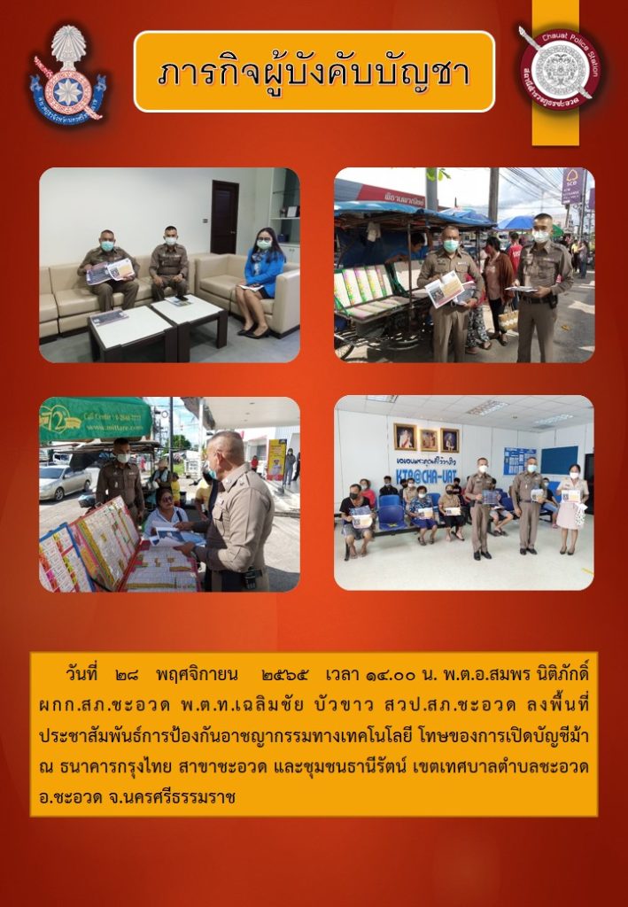 ภารกิจผู้บังคับบัญชา ๒๘ พฤศจิกายน ๒๕๖๕ 29 พฤศจิกายน 2565 โดย admin / ข่าวประชาสัมพันธ์,ข่าวประชาสัมพันธ์,ข่าวฝากประชาสัมพันธ์,ข่าวภารกิจผู้บังคับบัญชา,ข่าวภารกิจผู้บังคับบัญชา,ชุดปฏิบัติการตำรวจชุมชนสัมพันธ์,ข่าวประชาสัมพันธ์,ป้องกันอาชญากรรมทางเทคโนโลยี ประชาสัมพันธ์การป้องกันอาชญากรรมทางเทคโนโลยี เเละความผิดเกี่ยวกับการเปิดบัญชีม้า