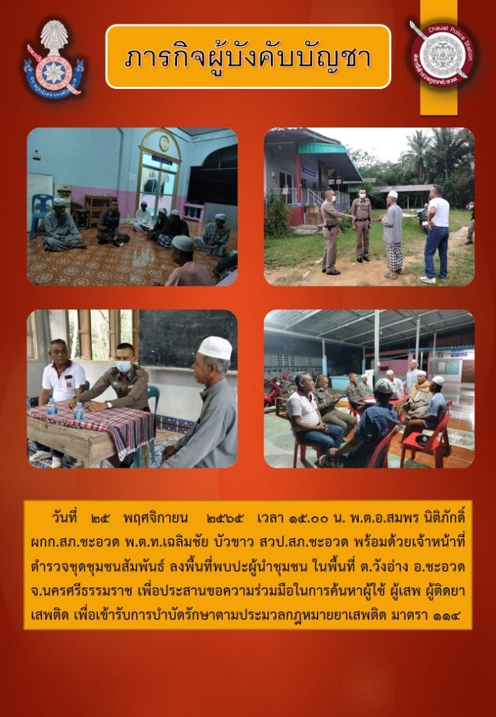 ภารกิจผู้บังคับบัญชา ๒๕ พฤศจิกายน ๒๕๖๕ 26 พฤศจิกายน 2565 โดย admin / ข่าวภารกิจผู้บังคับบัญชา,ข่าวภารกิจผู้บังคับบัญชา,ชุดปฏิบัติการตำรวจชุมชนสัมพันธ์ ลงพื้นที่พบปะผู้นำชุมชน ประสานขอความร่วมมือในการค้นหา ผู้ใช้ ผู้เสพ ผู้ติดยาเสพติด เพื่อเข้ารับการบำบัดรักษา