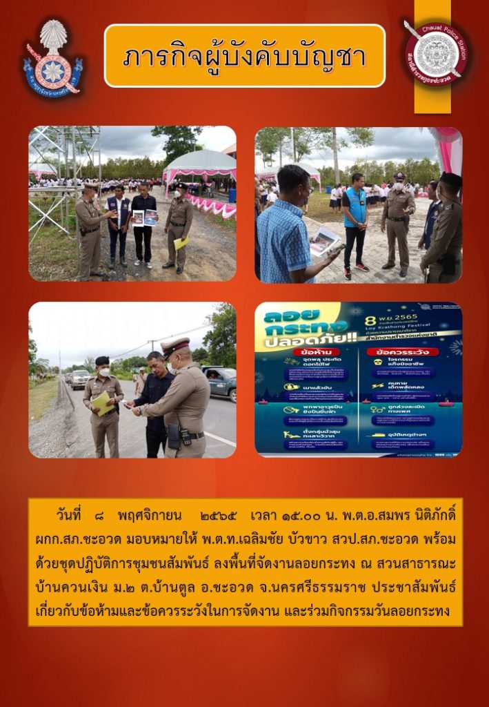 ภารกิจผู้บังคับบัญชา ๘ พฤศจิกายน ๒๕๖๕ 8 พฤศจิกายน 2565 โดย admin / ข่าวประชาสัมพันธ์,ข่าวภารกิจผู้บังคับบัญชา,ข่าวภารกิจผู้บังคับบัญชา,ชุดปฏิบัติการตำรวจชุมชนสัมพันธ์ ประชาสัมพันธ์ ข้อห้ามเเละข้อควรระวังในการจัดกิจกรรมวันลอยกระทง ๒๕๖๕