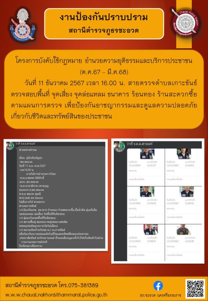 สายตรวจตำบล ตรวจพื้นที่ในเขตรับผิดชอบ 11 ธันวาคม 2567 โดย admin / งานป้องกันปราบปราม,งานป้องกันปราบปราม,ปป.ธันวาคม 2567