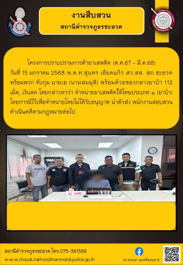 สืบสวนจับกุมคดียาเสพติด พร้อมของกลางยาบ้า 112 เม็ด