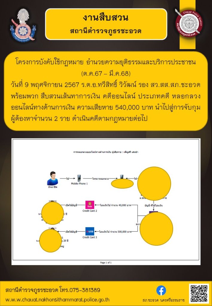 สืบสวนจับกุม คดีออนไลน์ ประเภทคดี หลอกลวงออนไลน์ทางด้านการเงิน ความเสียหาย 540,000 บาท นำไปสู่การจับกุมผู้ต้องหาจำนวน 2 ราย