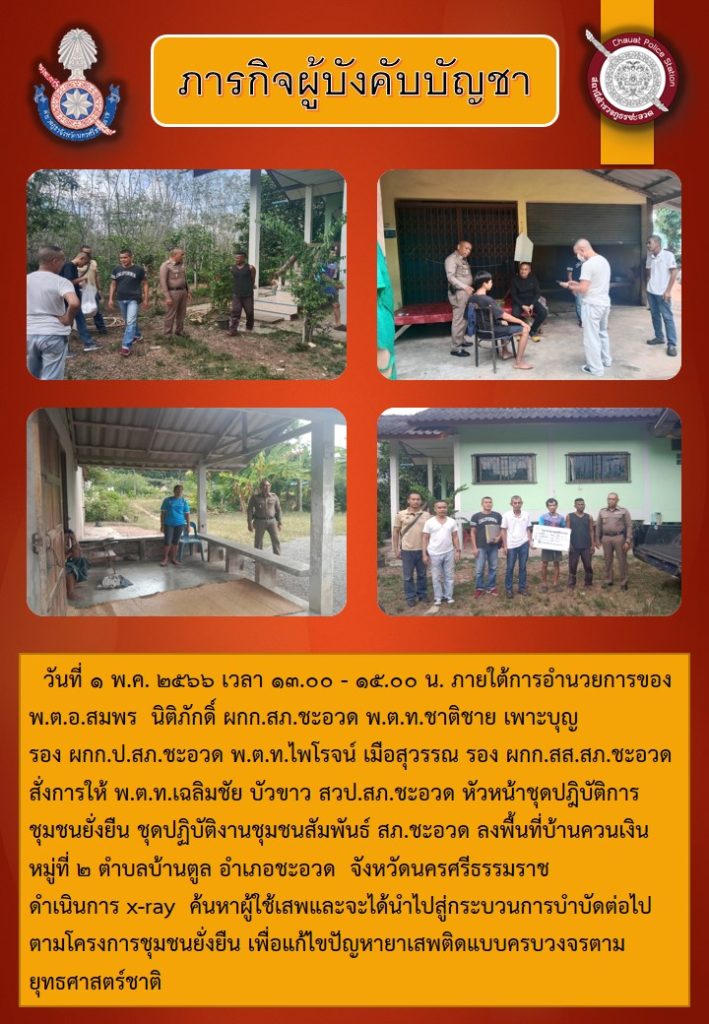 โครงการชุมชนยั่งยืน 1 พฤษภาคม 2566 โดย admin / ข่าวภารกิจผู้บังคับบัญชา,ข่าวภารกิจผู้บังคับบัญชา,ชุดปฏิบัติการตำรวจชุมชนสัมพันธ์,ข่าวภารกิจผู้บังคับบัญชา,โครงการ RTP Cyber Village,ข่าวภารกิจผู้บังคับบัญชา,โครงการชุมชนยั่งยืน ลงพื้นที่บ้านควนเงิน หมู่ที่ 2 ตำบลบ้านตูล อำเภอชะอวด จังหวัดนครศรีธรรมราชดำเนินการ x-ray ค้นหาผู้ใช้เสพและจะได้นำไปสู่กระบวนการบำบัดต่อไป ตามโครงการชุมชนยั่งยืน เพื่อแก้ไขปัญหายาเสพติดแบบครบวงจรตามยุทธศาสตร์ชาติ